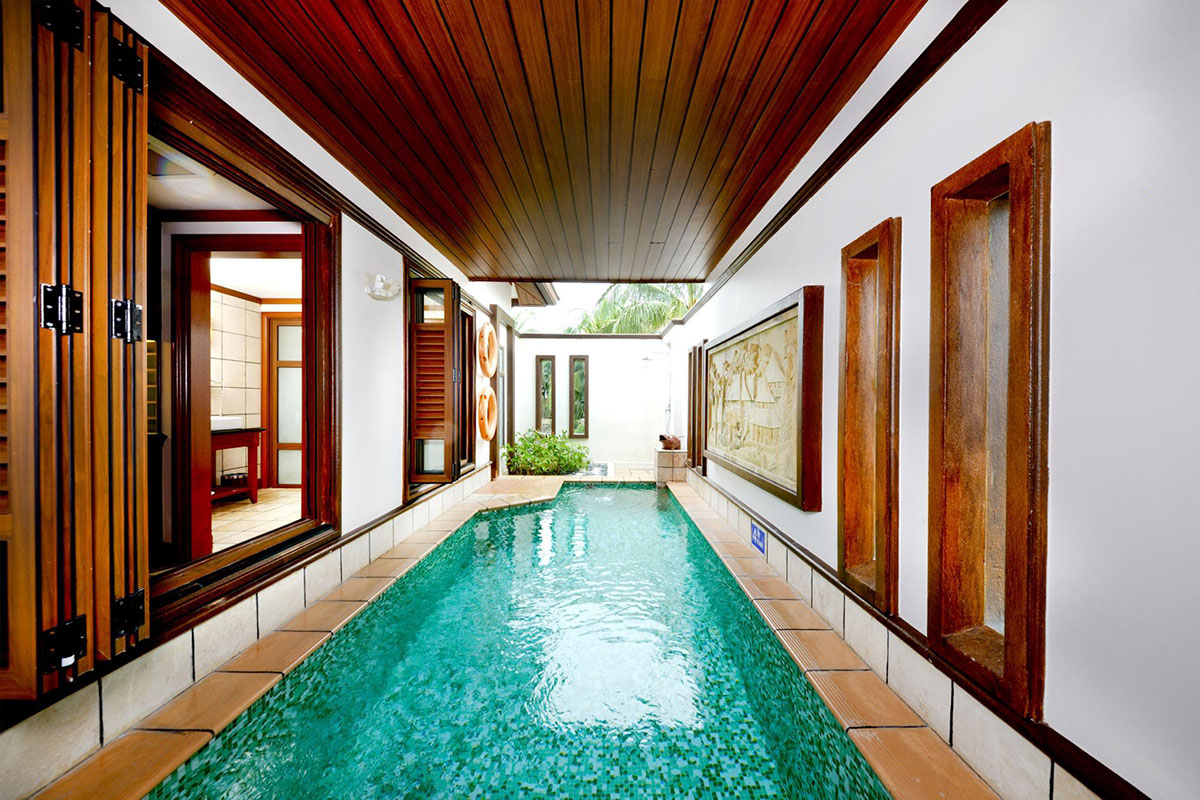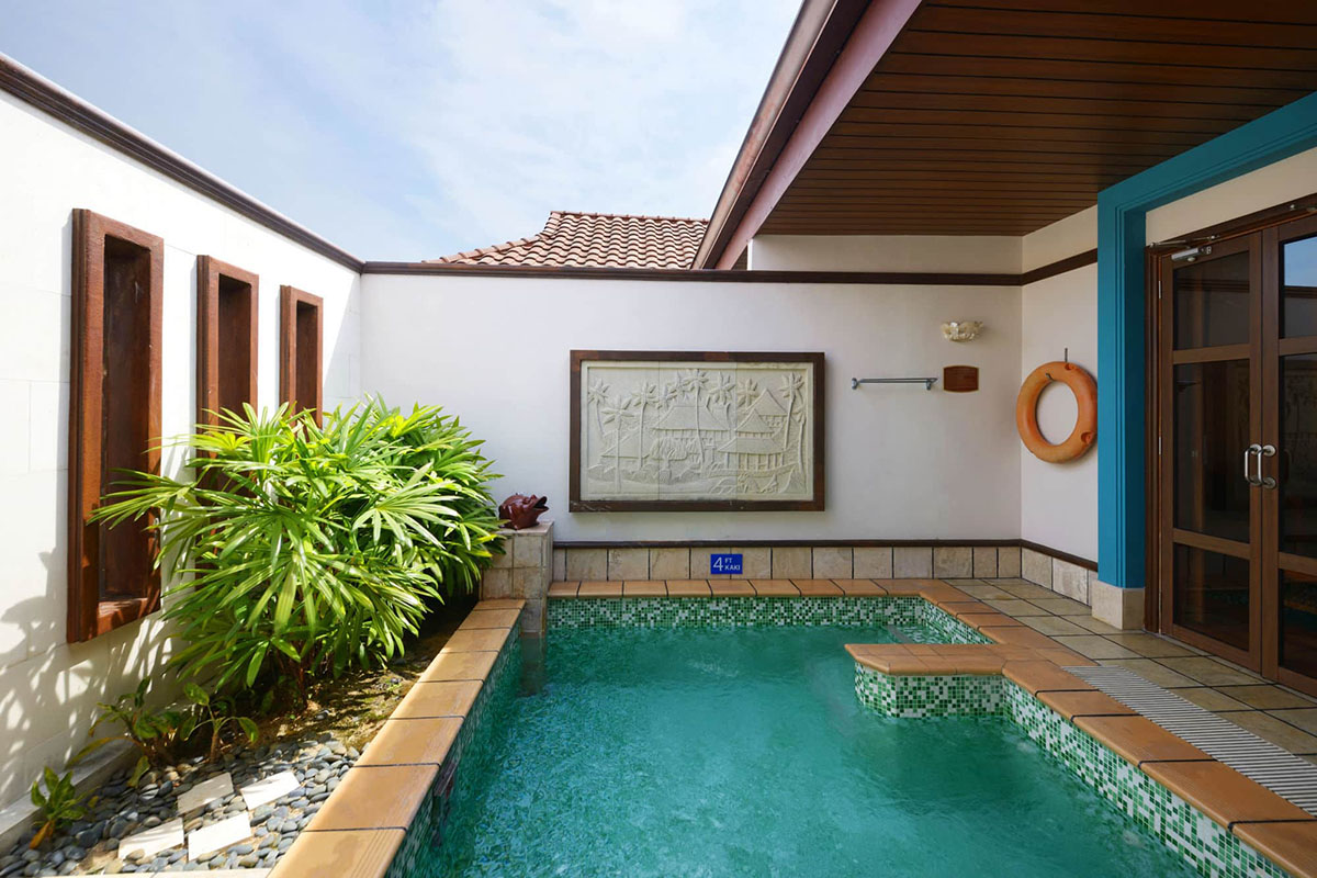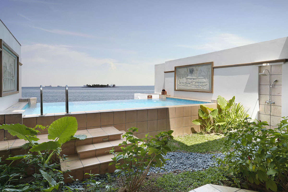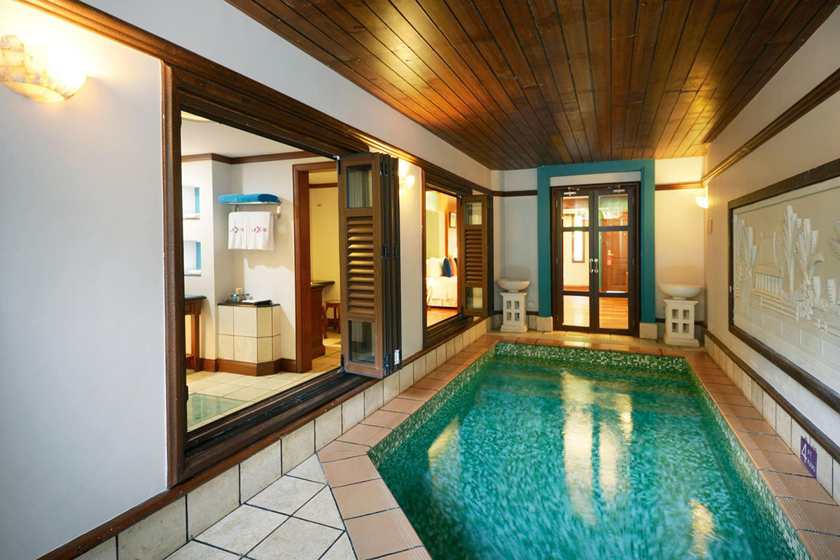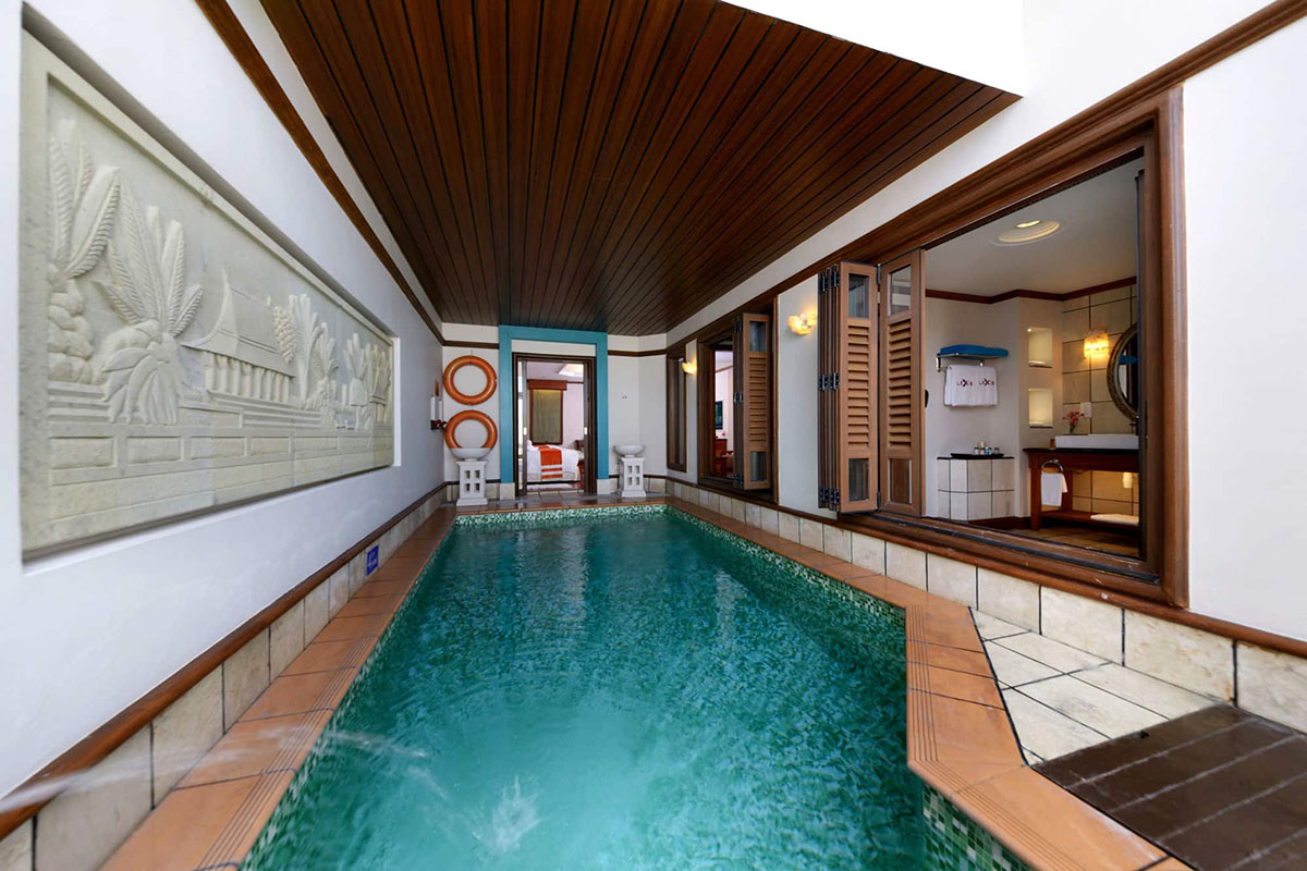 A tower block provides additional sky living accommodation - each room also with the private pool feature but suspended on semi-open balcony decks that open out to a view of sea. Finally, a garden wing nestled at the back provides cosy suite rooms housed in contemporary chalets, again with enclosed, private pools.
